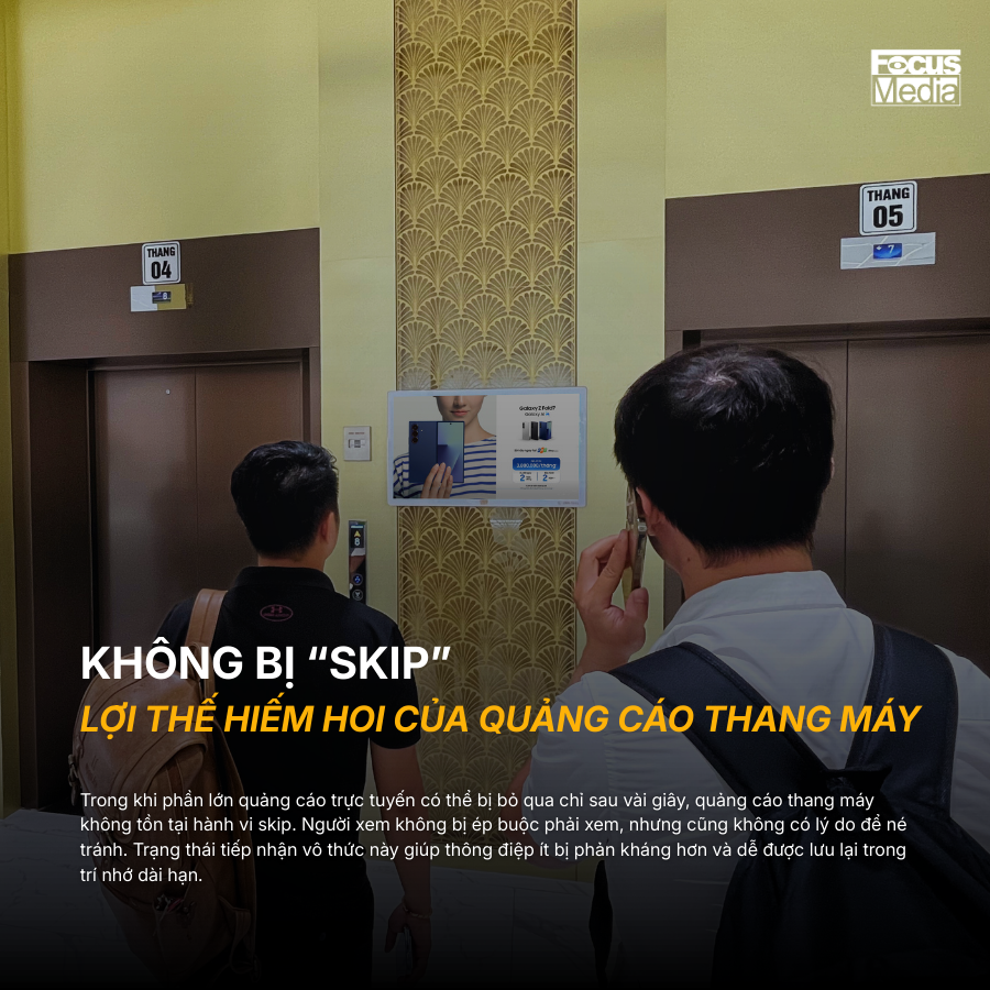Trong khi phần lớn quảng cáo trực tuyến có thể bị bỏ qua chỉ sau vài giây, quảng cáo thang máy không tồn tại hành vi skip. Người xem không bị ép buộc phải xem, nhưng cũng không có lý do để né tránh. Trạng thái tiếp nhận vô thức này giúp thông điệp ít bị phản kháng hơn và dễ được lưu lại trong trí nhớ dài hạn.