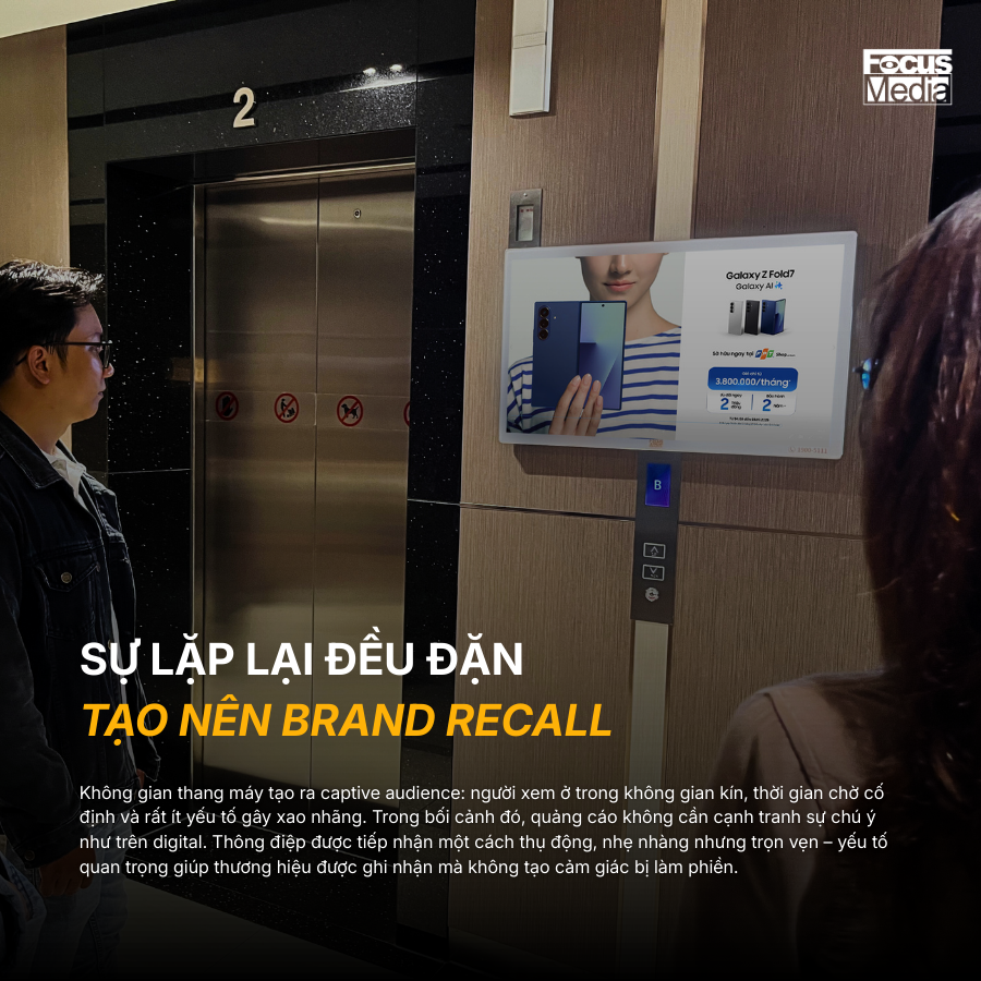 Brand recall không đến từ một lần xuất hiện ấn tượng, mà từ sự lặp lại ổn định theo thời gian. Quảng cáo thang máy xuất hiện đều đặn trong sinh hoạt hằng ngày – khi đi làm, về nhà, di chuyển trong không gian quen thuộc. Sự “quen mắt” này giúp thương hiệu dần trở nên thân thuộc, từ đó được ghi nhớ một cách tự nhiên và bền vững.